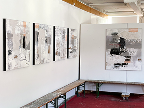 Together we create surfaces with depth in several steps before we condense and reduce the pictorial expression in dialogue with the world of colour and bring it to an expressive finish.